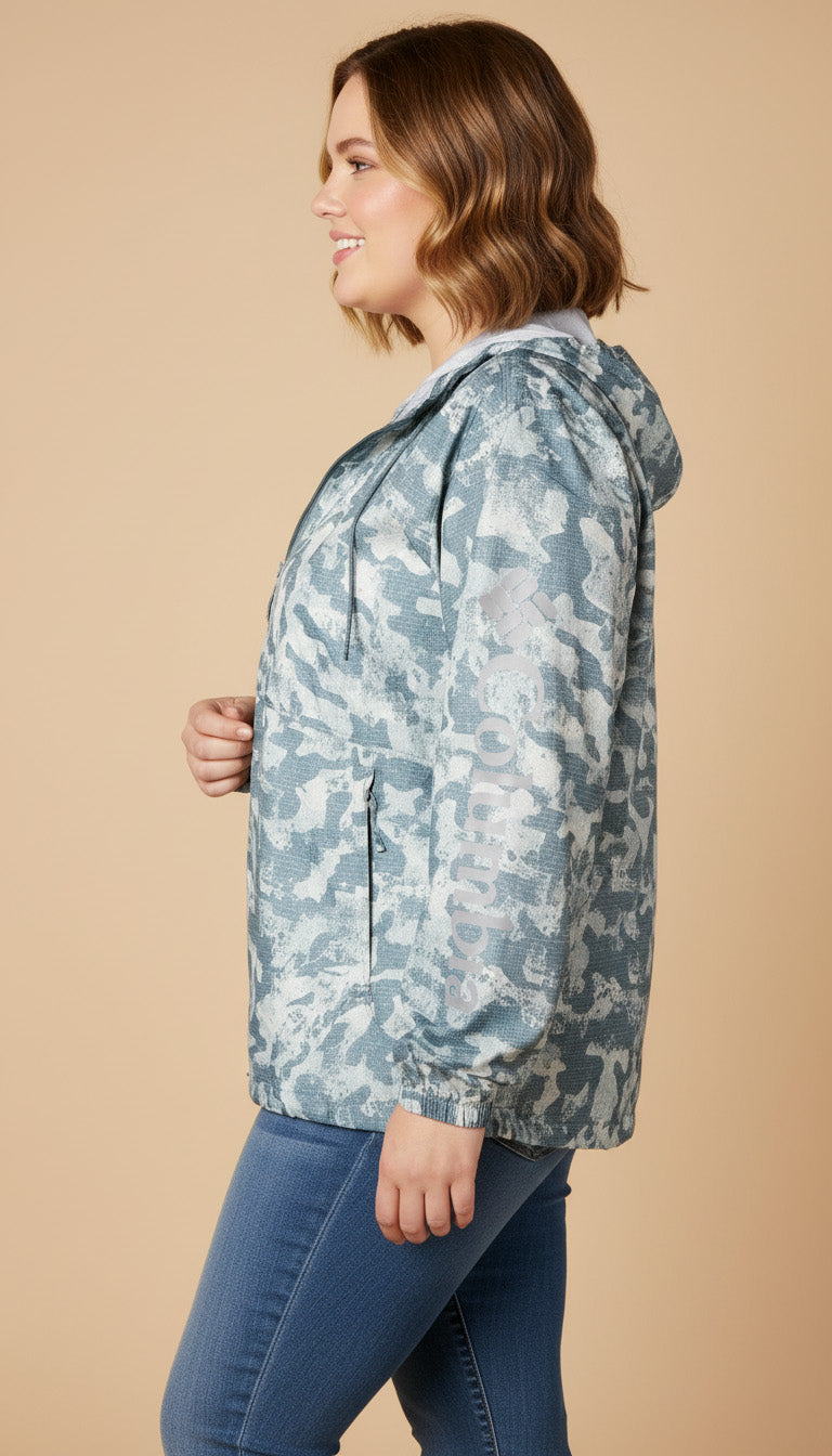 The Flash Forward Windbreaker From Columbia Features Adjustable Drawstrings At The Hood And Hem With A Playful Print Throughout And Two Zipper Pockets To Stow Your Small Items.