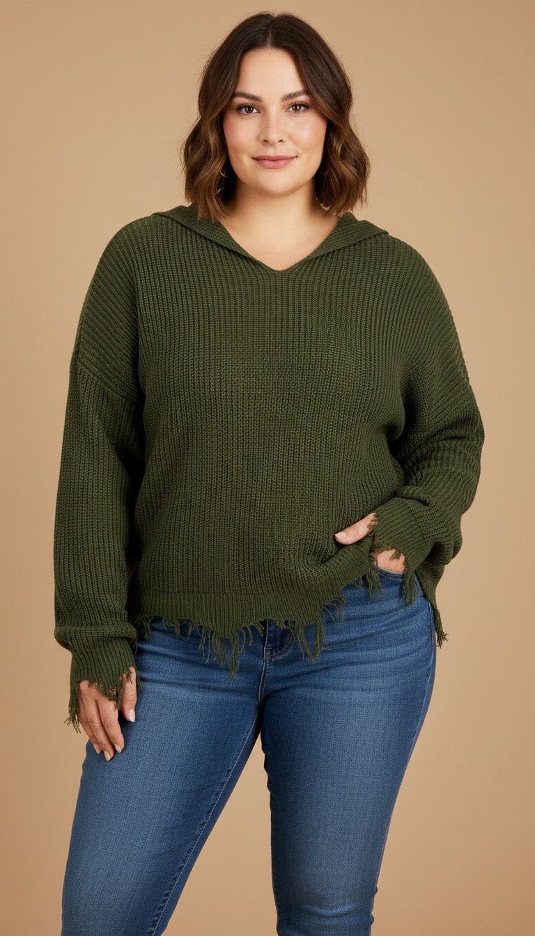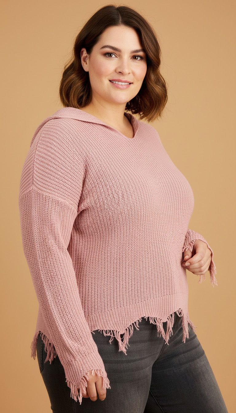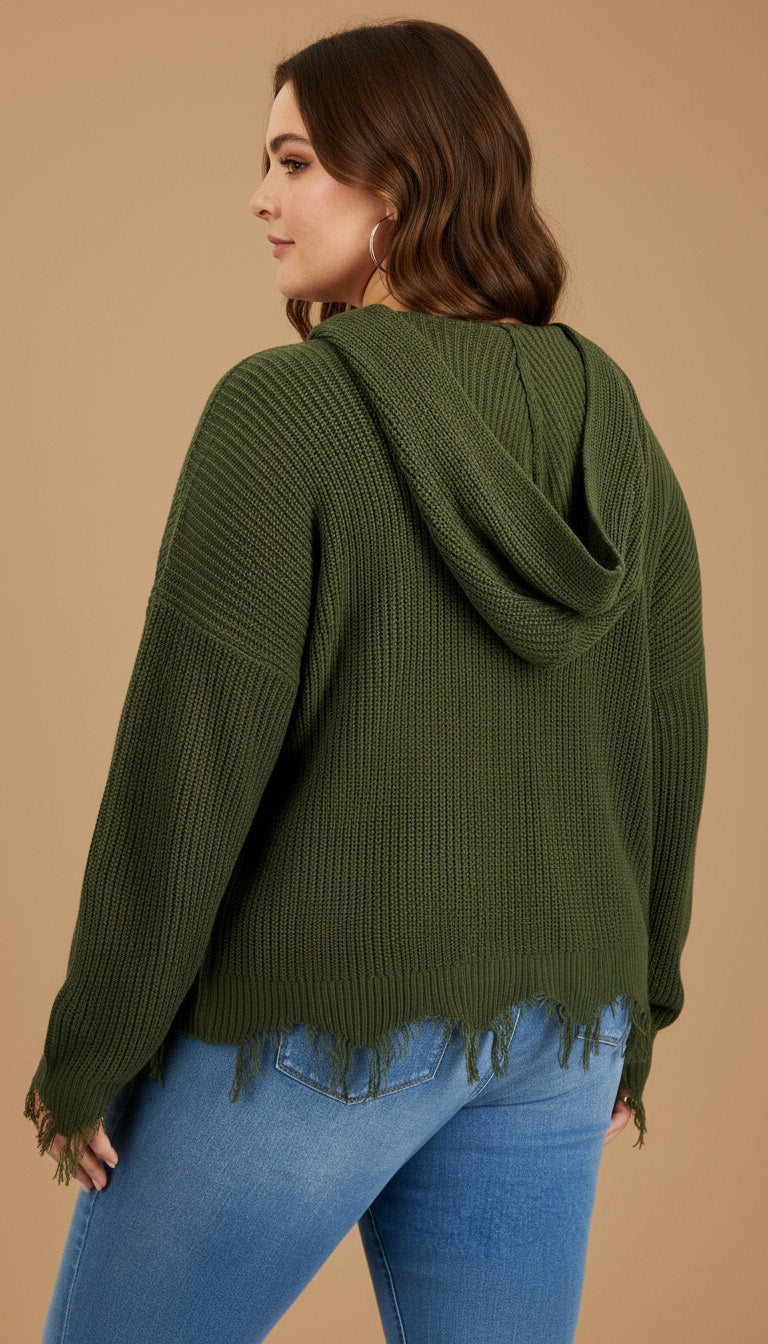 Distressed Details Add A Stylish Lived-In Look To This Plus Size Hooded Sweater From FULL CIRCLE TRENDS.